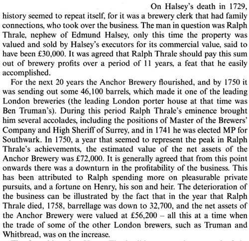 This mention of Ralph Thrale’s involvement in the Anchor Brewery is from “A History of Beer and Brewing,” by Ian Spencer Hornsey: