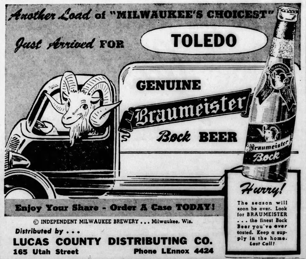Friday’s second ad is for Braumeister Bock Beer, which was published on April 10, 1950. This one was for This ad was for the Independent Milwaukee Brewery of Milwaukee, Wisconsin, which was originally founded in 1901 by Henry N. Bills, William Gutknecht, Charles Evers, Emil Czarnecki, and William Jung.