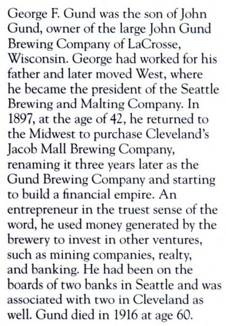 Today is the birthday of George F. Gund (April 5, 1855-March 11, 1916). He was the son of John Gund, the founder of John Gund Brewing, of La Crosse, Wisconsin, and the brother of Henry Gund and John Gund Jr., who founded Lexington Brewing, in Lexington, Kentucky. George Frederick Gund founded Gund Brewing Co., of Cleveland, Ohio.