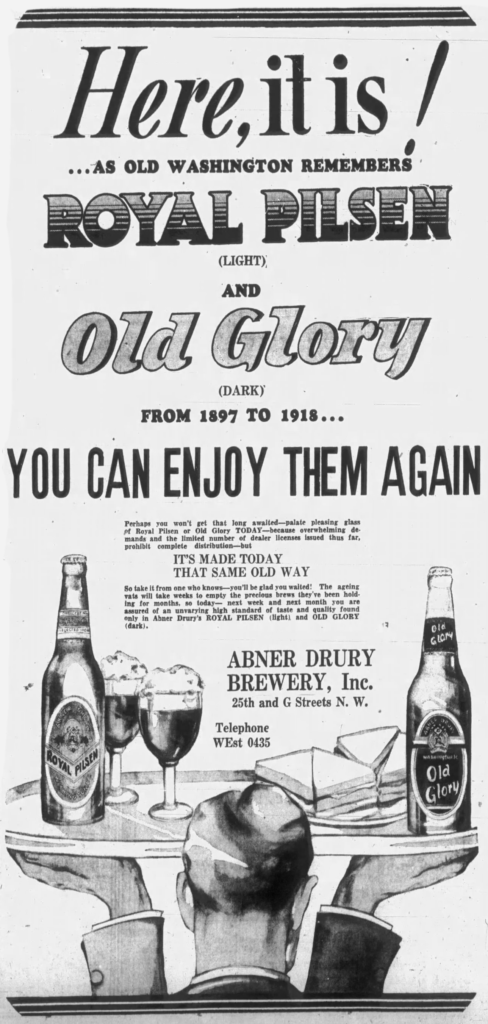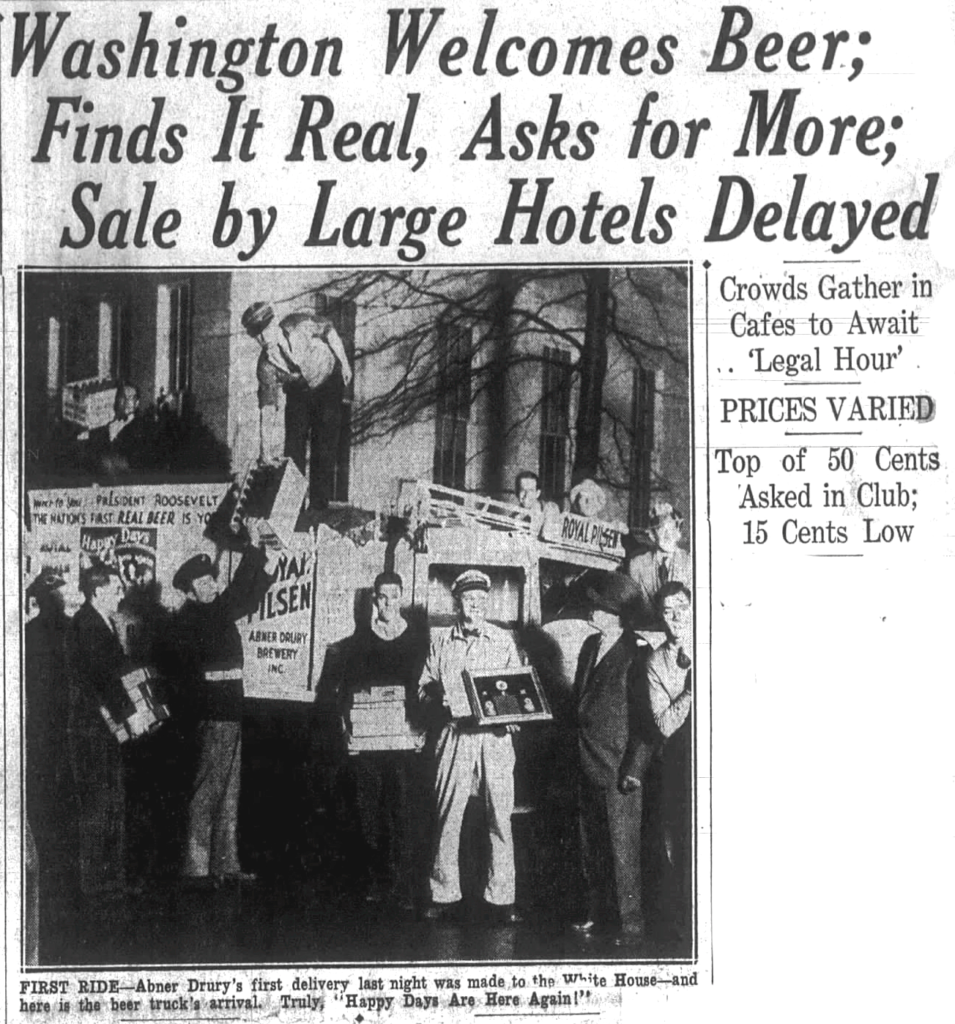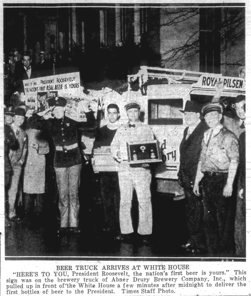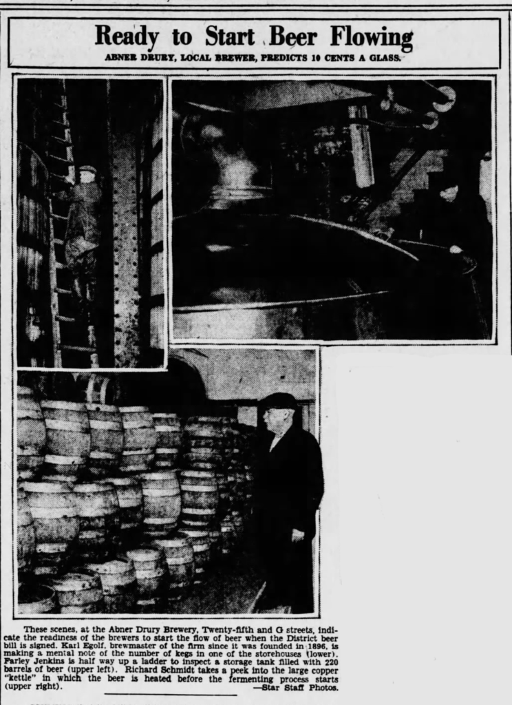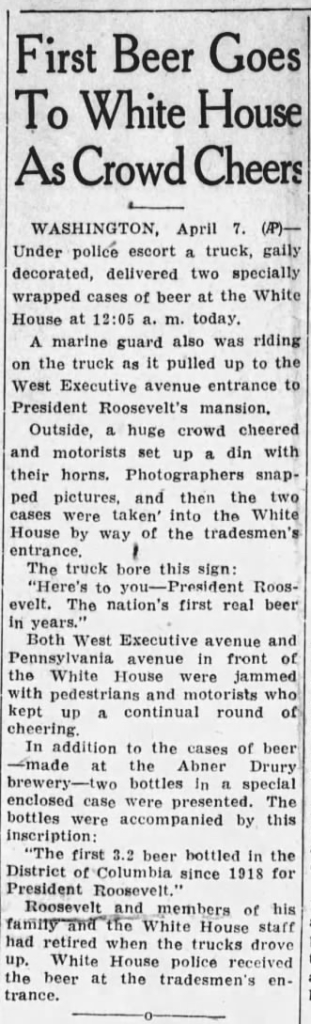 But as iconic as the photo is, it was not the first beer delivery on that day to the White House. While less well-known, it was widely reported on the day. That honor fell to a local brewery, the Abner-Drury Brewery. That brewery has originally been founded in D.C. in 1870 by John Albert, who in 1898 sold it to Edward F. Abner and Peter A. Drury, who renamed it. It survived prohibition, but not much longer, closing permanently in 1938.