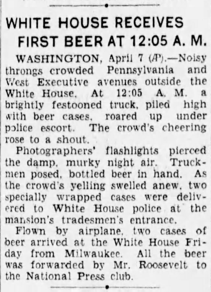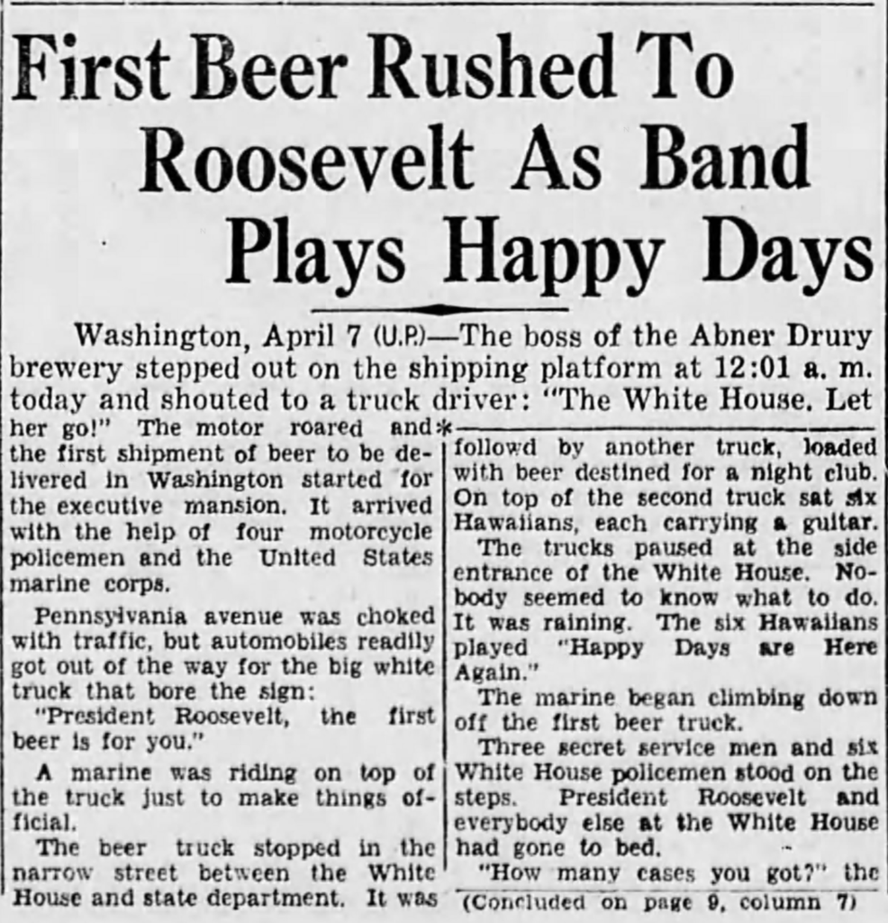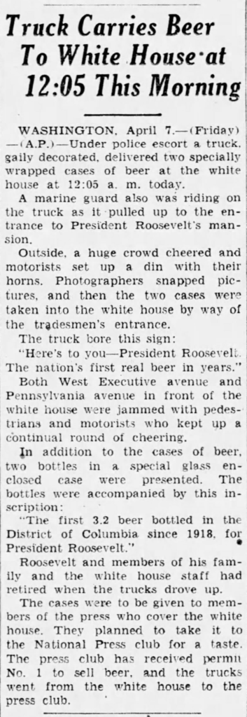 When the Cullen-Harrison Act took effect on April 7, 1933, it signaled that the national nightmare known as Prohibition was coming to end. In practical terms, it provided for the return of lower alcohol 3.2 beer (which is 3.2% by weight, or 4% ABV). Looking through the historic record, loads of people all over the nineteen states, plus the District of Columbia, where they could once more legally drink starting April 7, stayed up past midnight to get that first sip of beer in thirteen years. I think I would have done the same, honestly. A lot of politicians who helped to dismantle prohibition were sent some of the first cases of beer by grateful breweries who suddenly were able to get back to work, feeding their families and supporting the economy. There’s a famous photo of an Anheuser-Busch team of Clydesdale horses pulling a wagon of beer to deliver to the White house.