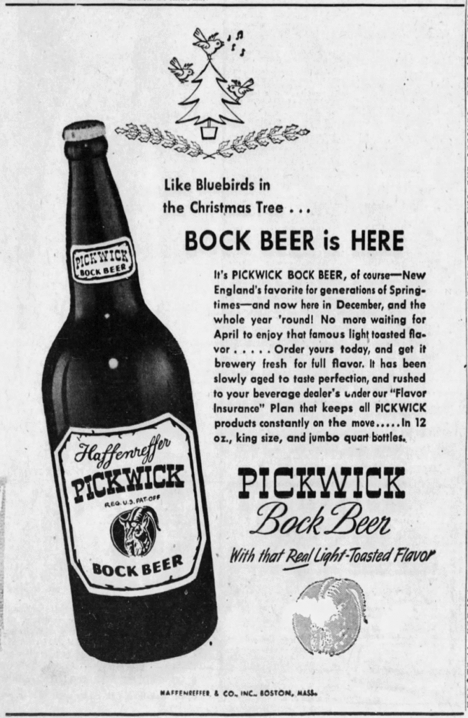 Wednesday’s ad is for Pickwick Bock Beer, which was published on December 17, 1953. The brewery was the Haffenreffer Brewery of Boston, Massachusetts, which was originally founded in 1870. It was located in the Jamaica Plain area of Boston, and today the site of the brewery is where the Boston Beer Co. operates one of its breweries. This ad ran in The Boston Globe of Boston, Massachusetts.