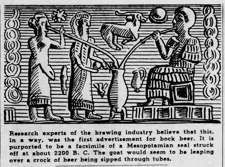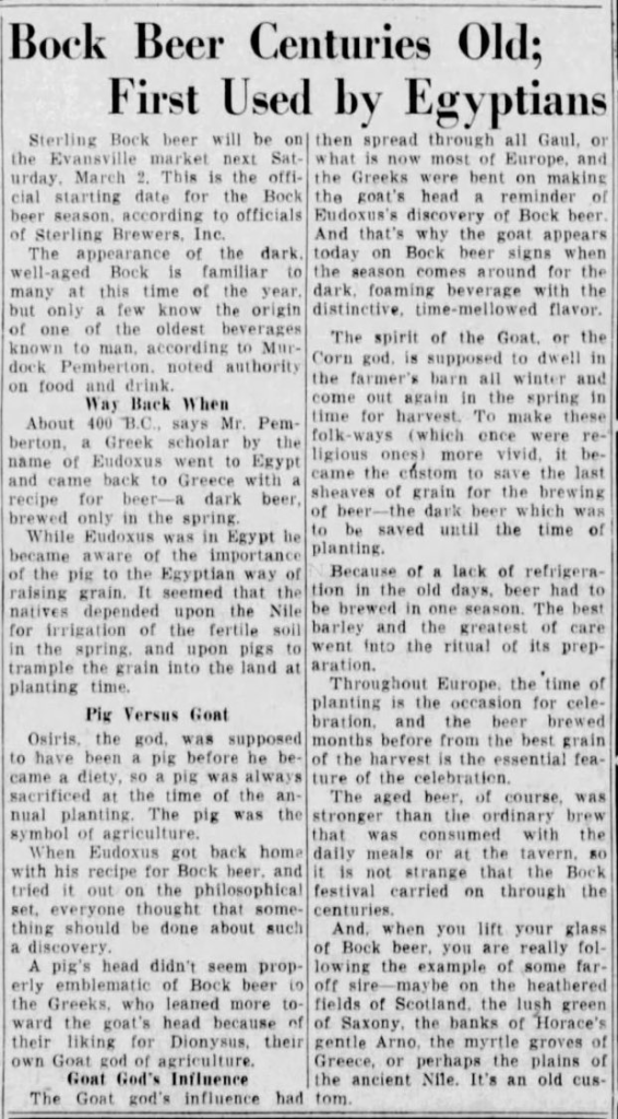 But the Bock oddity I found today is perhaps the strangest I’ve found so far, and deserves a bit more explanation and analysis. This one is a story entitled “Bock Beer Centuries Old: First Used By Egyptians,” and was published in the Evansville (Indiana) Courier and Press on February 26, 1940. In it, not only do “officials” from the local Sterling Brewers, Inc. suggest that Egyptian brewers were making Bock at least as early 400 B.C.E., but claim that that the beer was not originally associated with a goat, but a pig! Let that sink in. Imagine all of the Bock beer signs with pigs instead of goats. That would be odd, indeed.