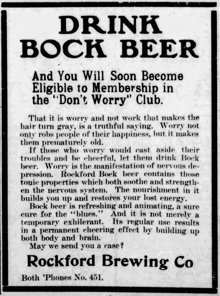 Friday’s first ad is for Ballentine’s Bock Beer, which was published on March 27, 1908. This one is from the Rockford Brewing Co., of Rockford, Illinois, which was originally founded in 1849 by Jonathan Peacock, which is why it was often known as the Peacock Brewery. This ad ran in The Rockford Register Star, also of Rockford, Illinois. The ad itself is quite plain, but I absolutely love the hilarious headline: “Drink Bock Beer And You Will Soon Become Eligible To Membership In The ‘Don’t Worry’ Club.”