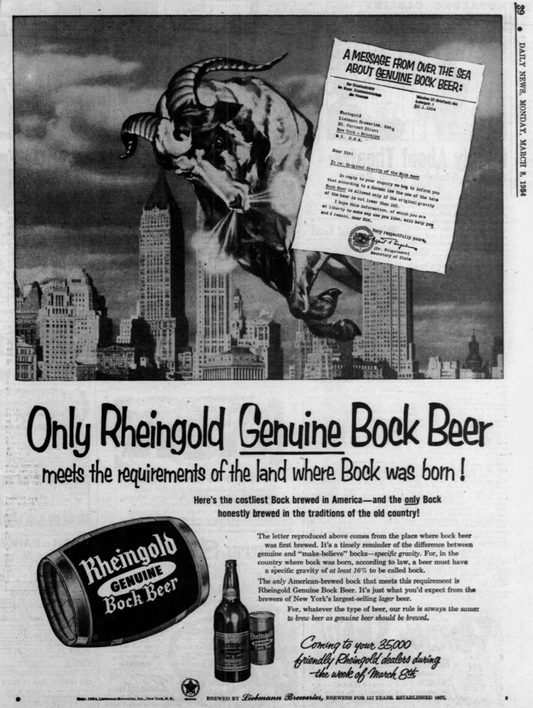 Sunday’s second ad is for Rheingold Bock Beer, which was published on March 8, 1954. This ad was for the Liebmann Breweries, of New York, New York, a.k.a. Rheingold Brewery, which was originally founded in 1854 by Samuel Liebmann. This ad ran in The Daily News, also of New York, New York.