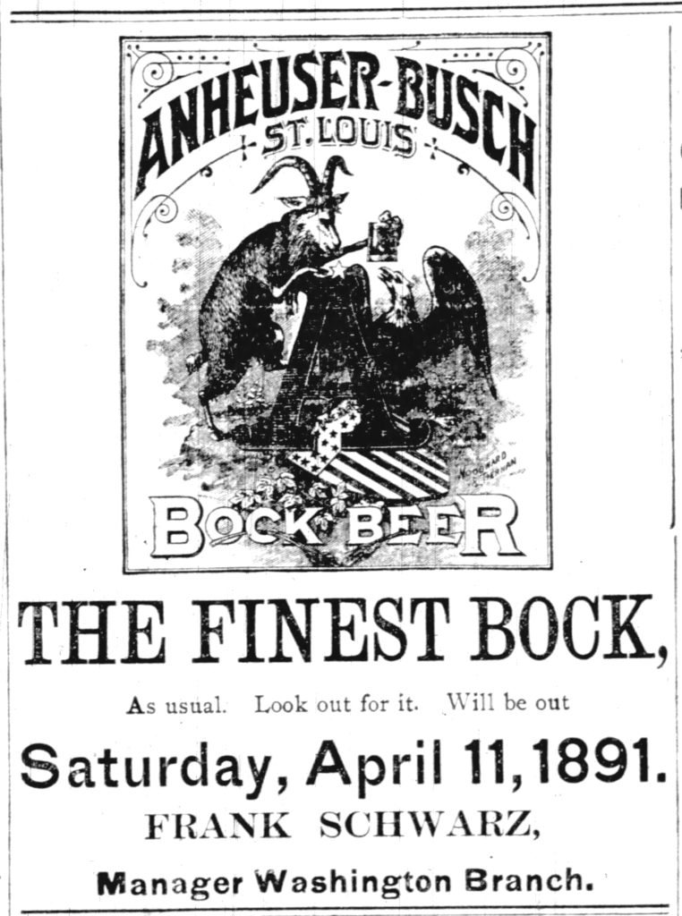 Saturday’s first ad is for Anheuser-Busch Bock Beer, which was published on April 11, 1891. This one was for the Anheuser-Busch Brewing Co., then of St. Louis, Missouri, which was originally founded in 1852 as the Bavarian Brewery by George Schneider. Eberhard Anheuser and Adolphus Busch, who’s married Anheuser’s daughter Lilly, had acquired it outright by 1869. The ad ran in the Washington Post, of Washington, D.C.