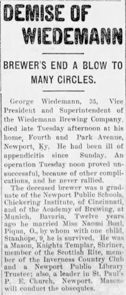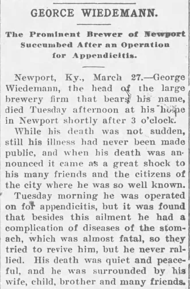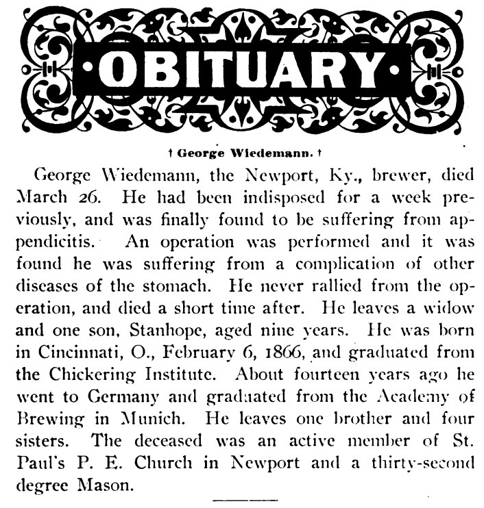 This is Wiedmann Junior’s obituary from the American Brewers’ Review from April 20, 1901:
