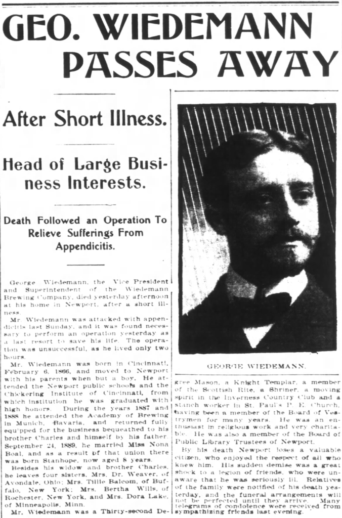 Today is the birthday of George Wiedemann Jr. (February 6, 1866-March 26, 1901). He was born in Cincinnati, Ohio, the son of George Wiedemann Sr., who founded the George Wiedemann Brewing Co. in 1870, in Newport, Kentucky. After his father passed away in 1890, he and his brother sons continued to run the business. After prohibition, the brewery merged with G. Heileman Brewing Company, and in 1967 was operated as the Wiedemann Division of the G. Heileman Brewing Company, Inc. The brewery was closed in 1983.