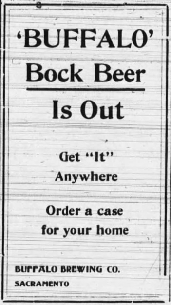 Monday’s ad is for Buffalo Bock Beer, which was published on September 29, 1915. This one was for the Buffalo Brewing Co. of Sacramento, California, which was originally founded in 1890. This ad ran in The Plumas Independent, which served Plumas County, California, located in the northeast part of the state, in the Sierra Nevada mountains. I love how they claim you can “Get ‘It’ Anywhere.”
