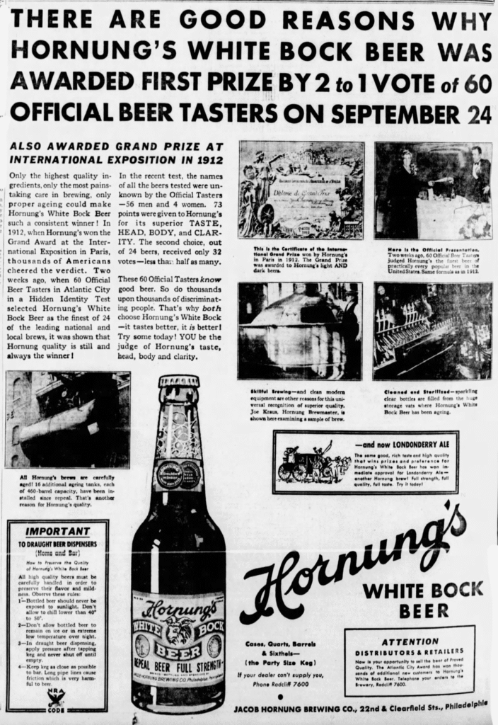 Sunday’s ad is for Hornung’s White Bock Beer, which was published on October 12, 1934. This one was for the Jacob Hornung Brewing Co. of Philadelphia, Pennsylvania, which was originally founded in 1885. I’m amazed how much they used winning two beer competitions in their advertising for years afterwards. This ad ran in The Philadelphia Inquirer, also from Philadelphia, Pennsylvania.