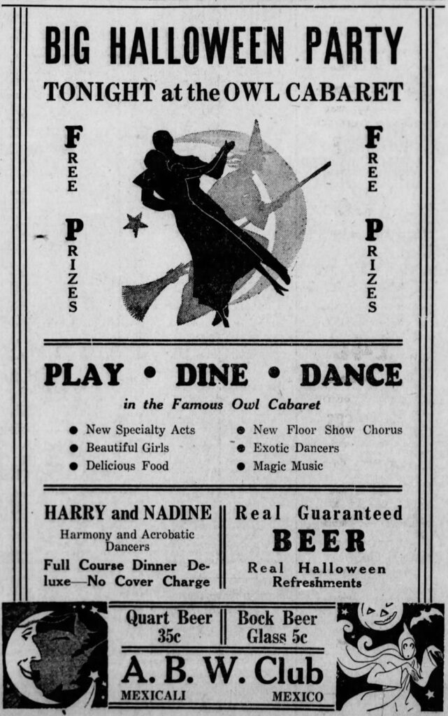Friday’s ad is for a Halloween Party taking place tonight rather than a specific Bock Beer, which was published on October 31, 1933. So presumably this would have been the first Halloween after prohibition was repealed, and they are advertising a Bock Beer Glass for 5-cents This one was for the Owl Cabaret at the A.B.W. Club in Mexicali, Mexico. This ad ran in The Imperial Valley Press, from El Centro, California.