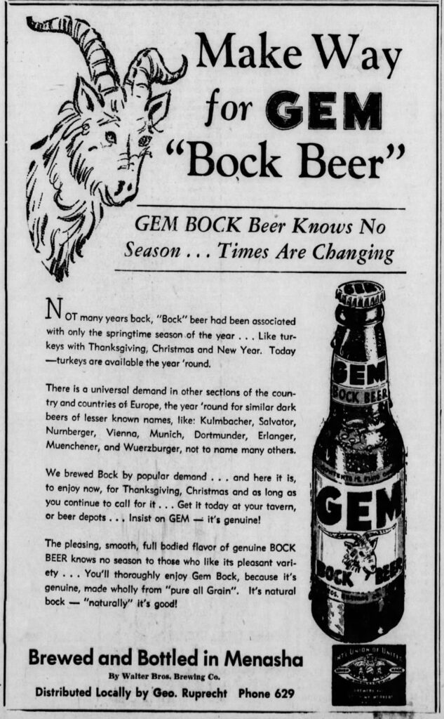 Thursday’s ad is for Gem Bock Beer, which was published on November 21, 1952. This ad was for the Walter Bros. Brewing Co. of Menasha, Wisconsin, which was originally founded as the Island City Brewery in 1860. It became known as Walter Bros. in 1933 after prohibition, although the brothers had been involved in the brewery since 1888. This ad ran in The Daily Tribune, from Wisconsin Rapids, Wisconsin.