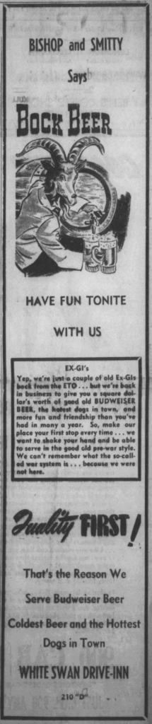 Tuesday’s ad is for an unspecified Bock Beer, which was published on December 2, 1945. This ad was for the White Swan Drive-Inn, possibly of Lawton, Oklahoma, but I can’t find any specific mention of it on the interwebs. The owners, Bishop and Smitty, are both Ex-GI’s freshly back in civilian life and running an establishment serving “the colest beer and the hottest dogs,” including Bock Beer. This ad ran in The Lawton Morning Press, from Lawton, Oklahoma.