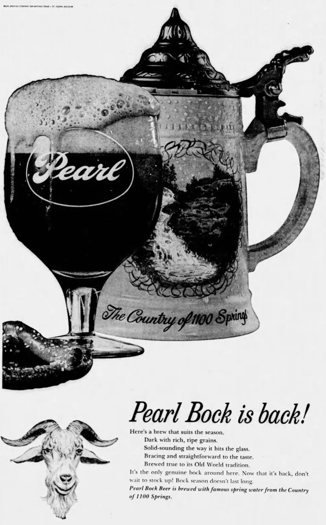 Wednesday’s first ad is for Pearl Bock Beer, which was published on February 25, 1966. This one was for Pearl Brewing Co., of San Antonio, Texas and was founded in 1883. This ad ran in The San Antonio Express News, also of San Antonio, Texas.