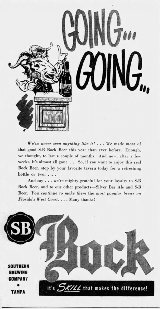 Thursday’s second ad is for SB Bock Beer, which was published on February 26, 1952. This one was for Southern Brewing Co., of Tampa, Florida and was founded in 1934 by August Schell. This ad ran in The Tampa Times, also of Tampa, Florida.