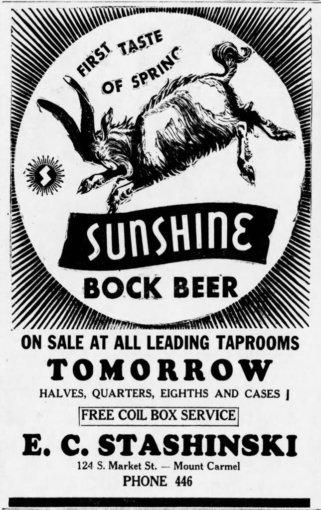 Tuesday’s second ad is for Sunshine Bock Beer, which was published on March 3, 1937. This ad was for the Sunshine Brewing Co. of Reading, Pennsylvania, near my hometown growing up, which was originally founded in 1859 by Peter Barbey. This ad ran in The Shamokin News Dispatch of Shamokin, Pennsylvania.