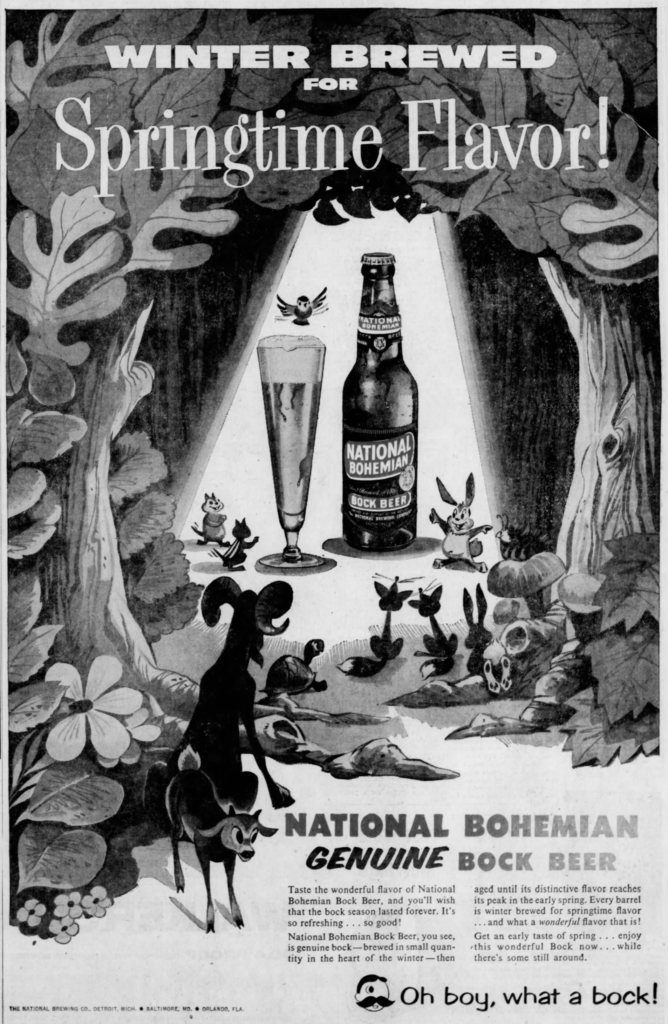 Two years ago I decided to concentrate on Bock ads for awhile. Bock, of course, may have originated in Germany, in the town of Einbeck. Because many 19th century American breweries were founded by German immigrants, they offered a bock at certain times of the year, be it Spring, Easter, Lent, Christmas, or what have you. In a sense they were some of the first seasonal beers. “The style was later adopted in Bavaria by Munich brewers in the 17th century. Due to their Bavarian accent, citizens of Munich pronounced ‘Einbeck’ as ‘ein Bock’ (a billy goat), and thus the beer became known as ‘Bock.’ A goat often appears on bottle labels.” And presumably because they were special releases, many breweries went all out promoting them with beautiful artwork on posters and other advertising. With Spring approaching, there are so many great examples that I’m going to post two a day for a few months.