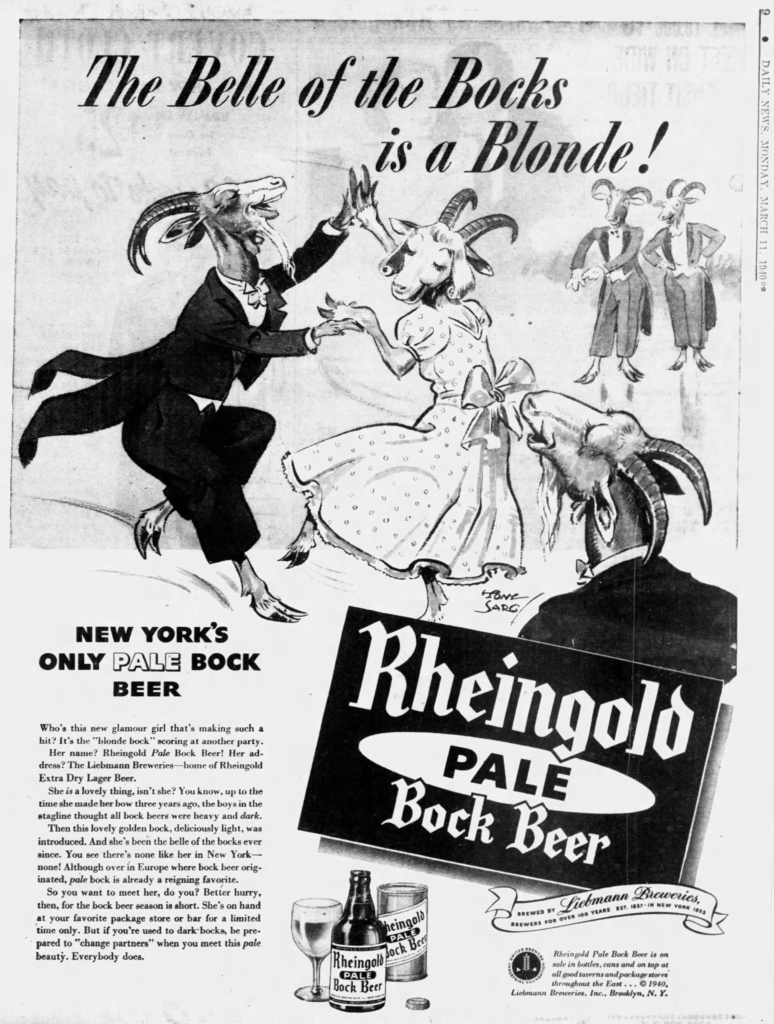 Wednesday’s first ad is for Rheingold Pale Bock Beer, which was published on March 11, 1940. This ad was for the Liebmann Breweries, of New York, New York, a.k.a. Rheingold Brewery, which was originally founded in 1854 by Samuel Liebmann. This ad ran in The Daily News, also of New York, New York.