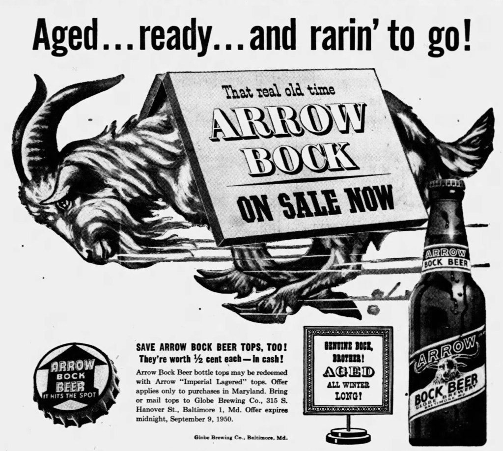Friday’s First ad is for Acme Bock Beer, which was published on March 13, 1950. This ad was for the Globe Brewing Co., of Baltimore, Maryland, which was originally founded in 1748 by John Leonard Barnitz and Elias Daniel Barnitz, though the Globe name doesn’t appear until around 1899. This ad ran in The Salisbury Times, of Salisbury, Maryland.