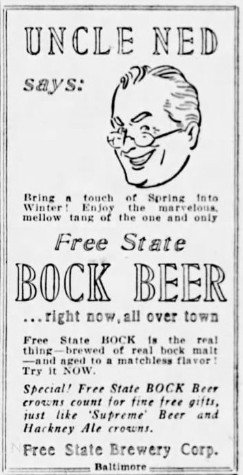 Sunday’s ad is for Free State Bock Beer, which was published on January 4, 1940. This ad was for the Free State Brewery Corp. of Baltimore, Maryland, which was originally founded in 1900 by Frederick Bauerschmidt, but was known as Free State after Prohibition ended until 1950. This ad ran in The Evening Sun, of Baltimore, Maryland.