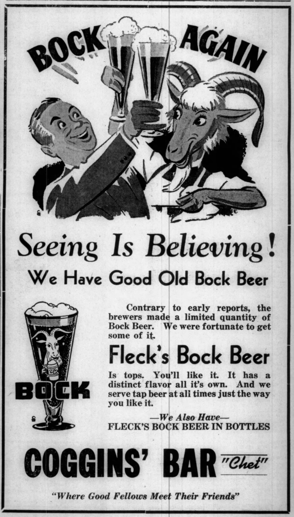 Wednesday’s first ad is for Fleck’s Bock Beer, which was published on March 18, 1943. This ad was for the Fleckenstein Brewing Co. of Faribault, Minnesota, which was originally founded in 1872 by Ernest Fleckenstein as the Straight River Brewing Co. This ad ran in The Blooming Prairie Times, of Blooming Prairie, Minnesota.