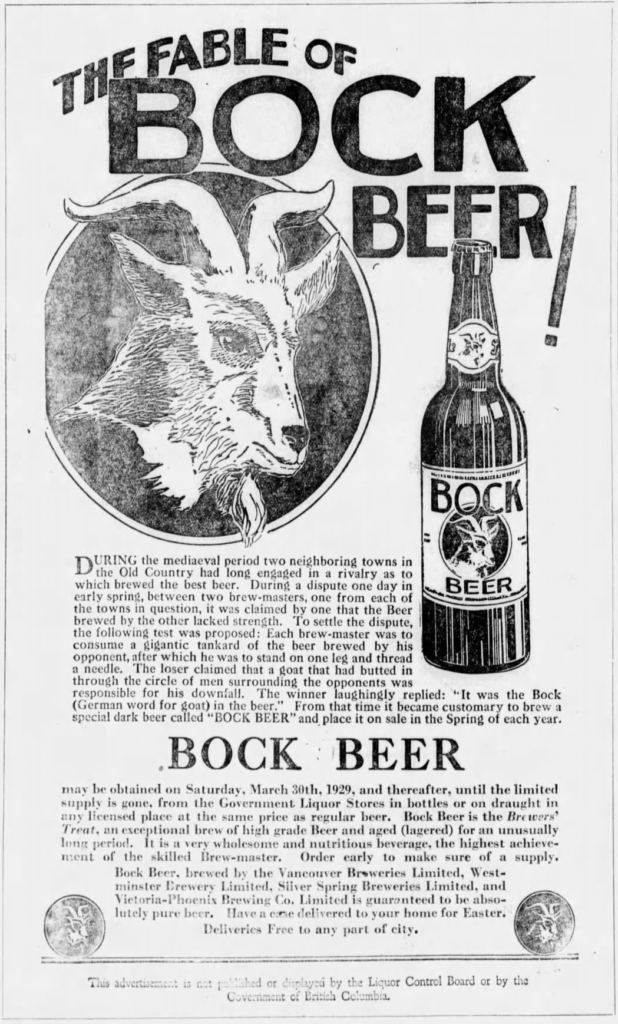 Saturday’s second ad is for multiple Canadian Bock Beers, which was published on March 21, 1929 in Vancouver, Canada, where there was no national prohibition at that time. This ad was for the Government Liquor Stores of British Columbia. This ad ran in the Vernon News, of Vancouver, British Columbia.