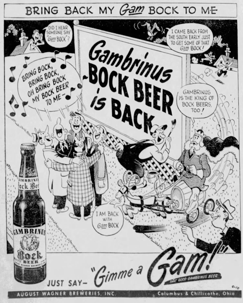 Monday’s first ad is for Gambrinus Bock Beer, which was published on March 23, 1951. This one was for the August Wagner Breweries, Inc., of Columbus and Chillicothe, Ohio and was founded in 1906 as the Gambrinus Brewing & Bottling Co. This ad ran in The Springfield News-Sun, of Springfield, Ohio.