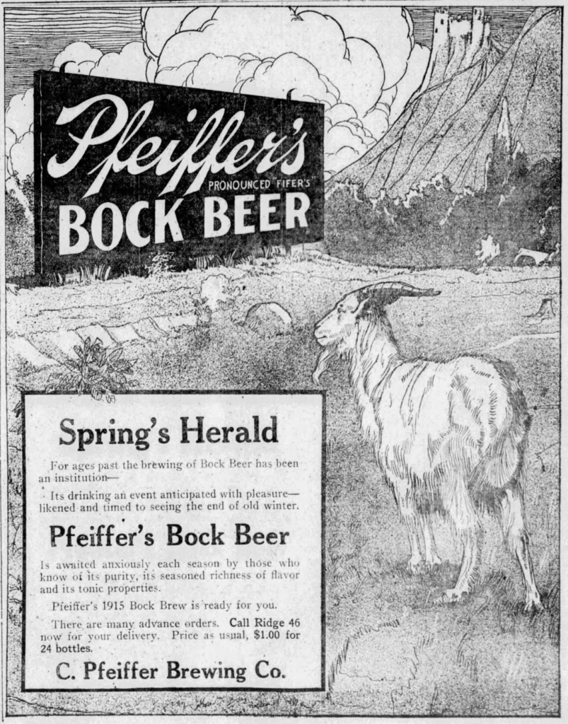Tuesday’s first ad is for Pfeiffer’s Bock Beer, which was published on March 24, 1915. This one is from the C. Pfeiffer Brewing Co., of Detroit, Michigan, which was originally founded in 1899 by Conrad Pfeiffer. This ad ran in The Detroit Free Press, also of Detroit, Michigan.