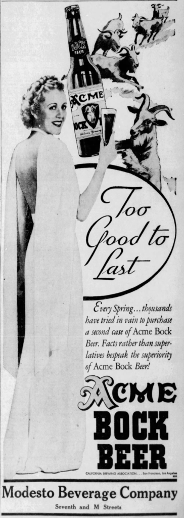 Wednesday’s second ad is for Acme Bock Beer, which was published on March 25, 1936. This ad was for the Acme Brewing Co. of San Francisco, California, which was originally founded in 1907, though they also opened a location in the Los Angeles area. Today the brand is owned by North Coast Brewing. This ad ran in The Modesto Bee, of Syracuse, New York.