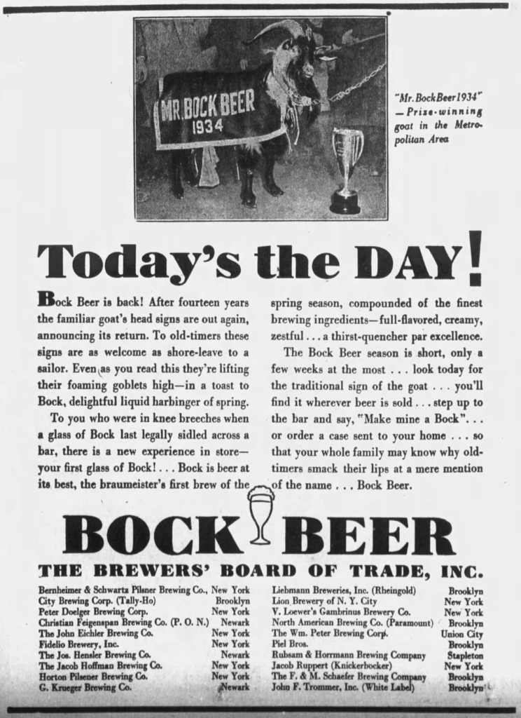 Thursday’s first ad is for Bock Beer at least twenty breweries located in Brooklyn, Union City, Stapleton, Newark, and New York itself (by which I assume they mean Manhattan but it’s not clear) which was published on March 26, 1934. This ad was for the Brewers Board of Trade, Inc. of New York, which appears to have been a local trade organization active from the 1930s through perhaps as late as 1960. They were celebrating the fact that this was the first Bock release in fourteen years, and the first one after prohibition was repealed. This ad ran in The Brooklyn Eagle, of Brooklyn, New York.