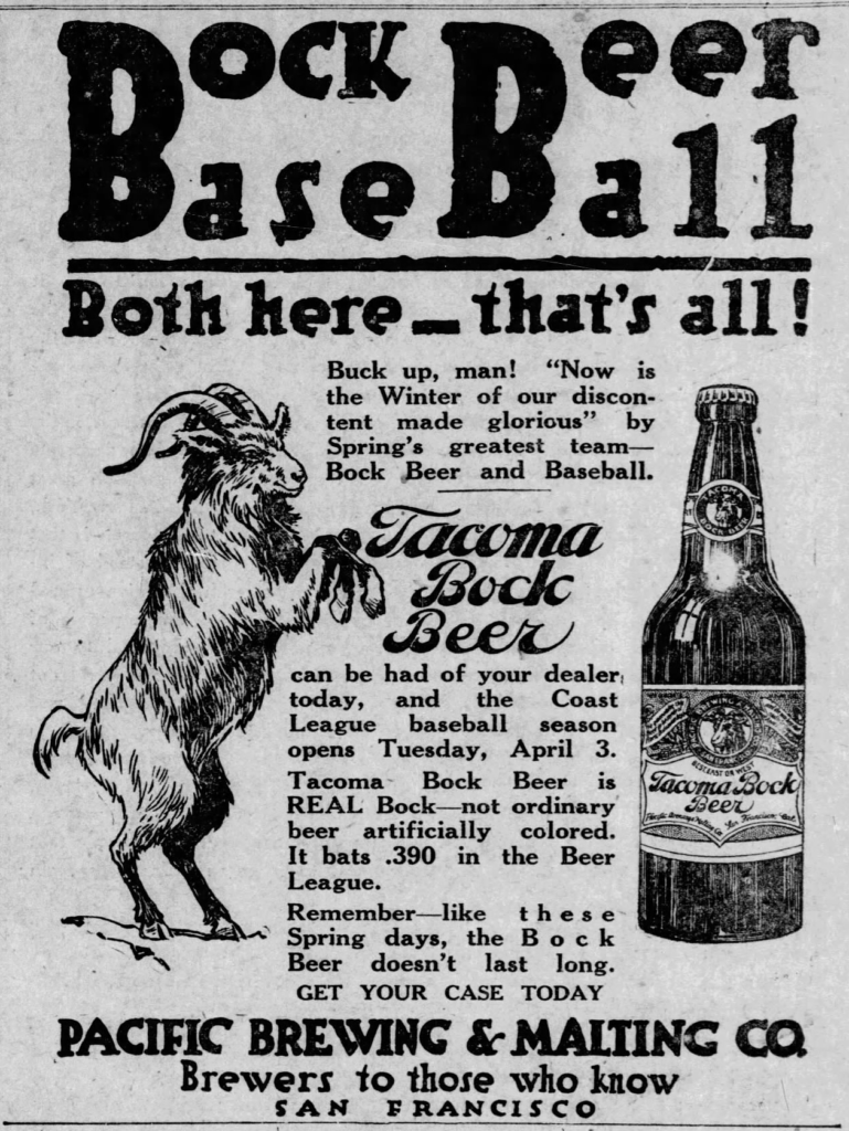 Tuesday’s first ad is for Tacoma Bock Beer, which was published on March 31, 1917. This one was for the Pacific Brewing & Malting Co., which was founded in 1897 in Tacoma, Washington. They also had a location in San Jose, California that was founded as the Krahenburg & Co., or Fredricksburg Brewery, in 1872, but apparently was bought by the Tacoma brewery who called by their own name from 1933-1951. But the ad below lists San Francisco, California, not just in the ad but San Francisco is printed on the bottle depicted in the ad, as well, so perhaps they had a facility in the city there. This ad has one of my favorite text blurbs from any ad: “Buck up, man! ‘Now is the Winter of our discontent made glorious’ by Spring’s greatest teams — Bock Beer and Baseball.” This ad ran in The Bulletin, also of San Francisco, California.