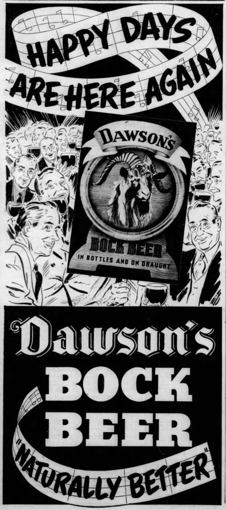 Sunday’s ad is for Dawson’s Bock Beer, which was published on February 8, 1940. This one was for Dawson’s Brewery, of New Bedford, Massachusetts and was founded in 1899. This ad ran in The Boston Globe, of Boston, Massachusetts.