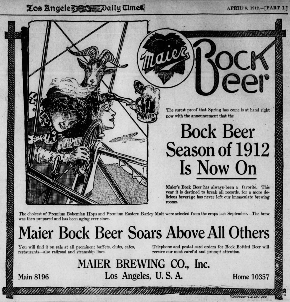 Monday’s first ad is for Maier Bock Beer, which was published on April 6, 1912. This one was for the Maier Brewing Co., of Los Angeles, California, which was originally founded in 1874 by Wattelet & Vogel, as, curiously, the Philadelphia Brewery, though Maier became involved at least as early as 1882. This ad ran in The Los Angeles Times, also of Los Angeles, California.