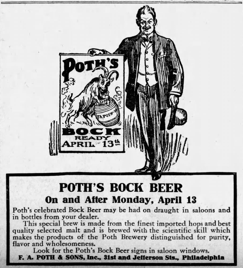Friday’s first ad is for Poth Bock Beer, which was published on April 10, 1908. This one was for the F.A. Poth Brewing Co., of Philadelphia, Pennsylvania, which was originally founded in 1864. This ad ran in the Trenton Evening Times, of Trenton, New Jersey.