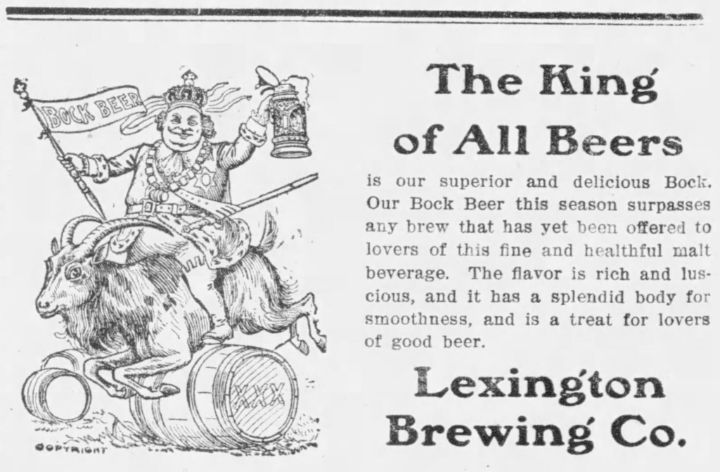 Saturday’s second ad is for Lexington Bock Beer, which was published on April 11, 1903. This one was for the Lexington Brewing Co., of Lexington, Kentucky, which was originally founded in 1897. The ad ran in the Lexington Herald Leader, also of Lexington, Kentucky.