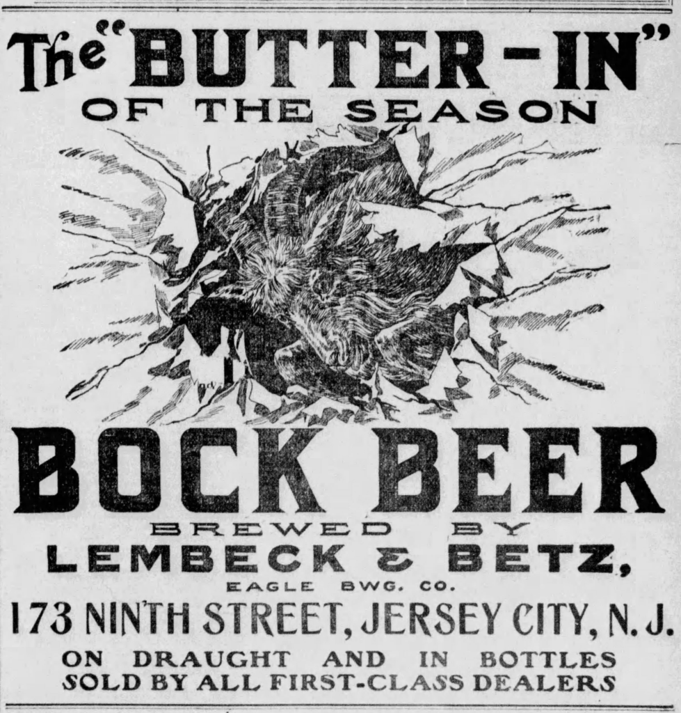 Sunday’s first ad is for Lembeck & Betz Bock Beer, which was published on April 12, 1906. This one was for the Lembeck & Betz Eagle Brewing Co., of Jersey City, New Jersey, which was originally founded in 1869 Henry Lembeck and John Betz. The ad ran in the Jersey Journal, also of Jersey City, New Jersey