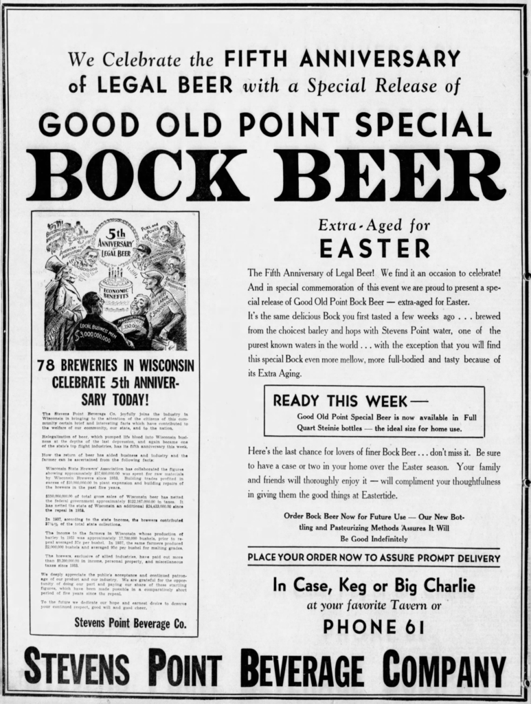 Sunday’s second ad is for Point Special Bock Beer, which was published on April 12, 1938. This one was for the Stevens Point Brewery of Stevens Point, Wisconsin, which was originally founded in 1857 and is still brewing today. This ad ran in The Stevens Point Journal, also of Stevens Point, Wisconsin. I love that the ad is celebrating the fifth anniversary of the repeal of prohibition, and that their beer was “Extra-Aged for Easter,” whatever that means. The inset describes a statewide brewery celebration throughout Wisconsin.
