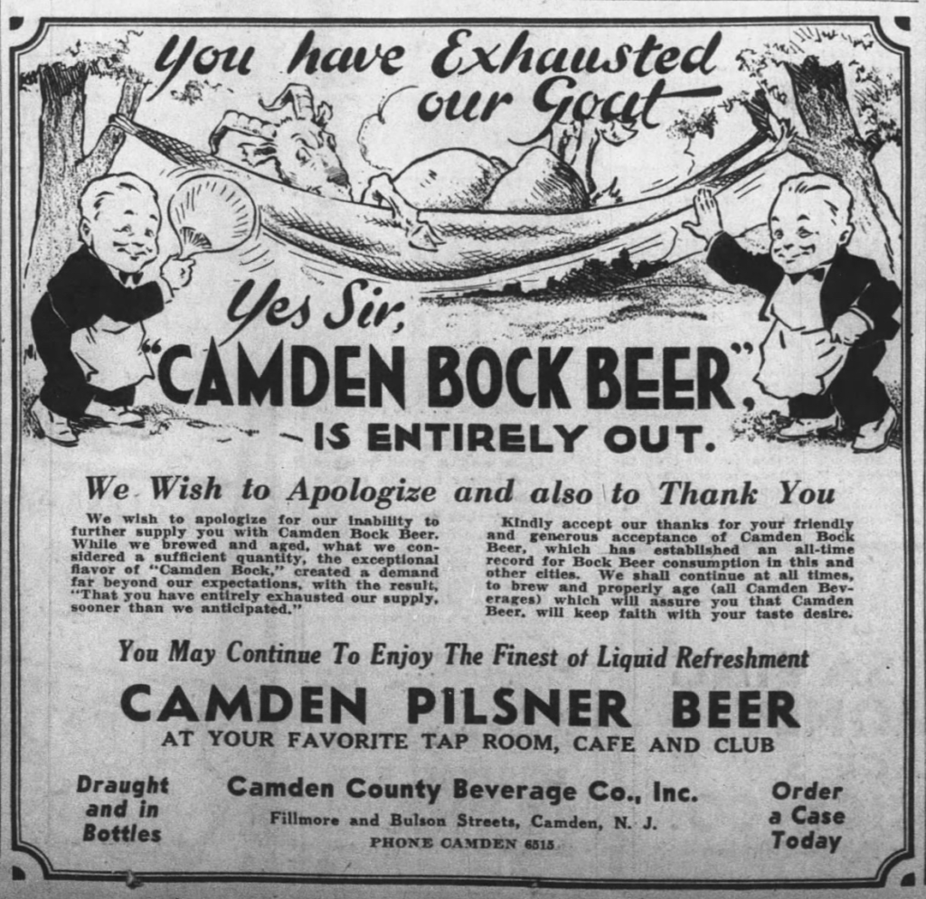 Wednesday’s ad is for Camden Bock Beer, which was published on April 15, 1937. This ad was for the Camden County Beverage Co. of Camden, New Jersey, which was originally founded in 1904. This ad ran in The Evening Courier-Post, of Camden, New Jersey.