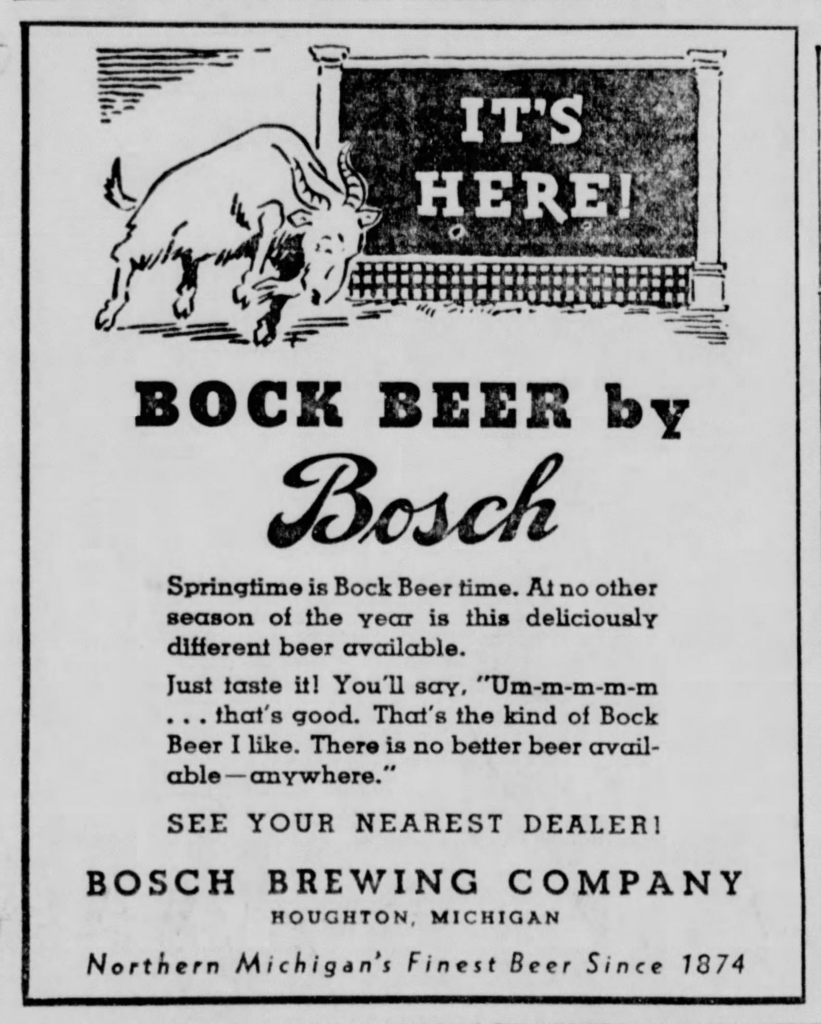 Monday’s ad is for Bosch Brewing Bock Beer, which was published on April 20, 1935. This ad was for the Bosch Brewing Co., of Houghton, Michigan and was founded in 1857 by William Ault. This ad ran in The Escanaba Daily Press, of Escanaba, Michigan.
