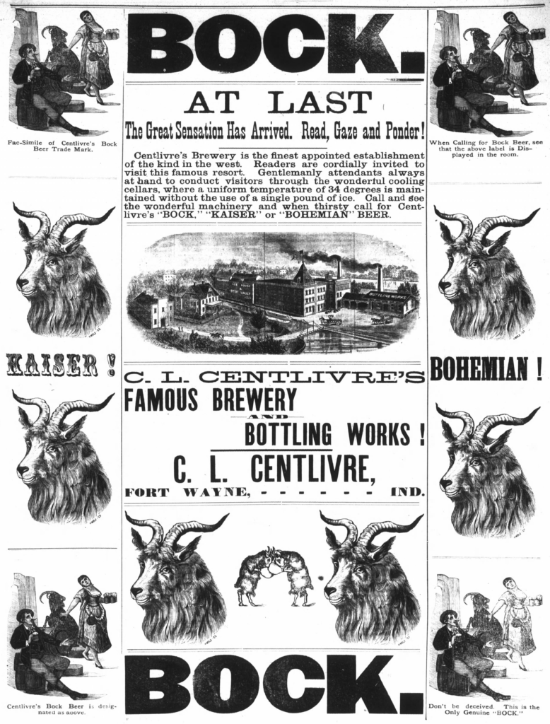 Friday’s ad is for Centilvre Bock Beer, which was published on April 24, 1886. This ad was for the C.L. Centlivre Brewing Co. of Fort Wayne, Indiana, which was founded in 1862 by Charles l. Centlivre. It went through several name changes until 1970, when it closed, however it was recently relaunched by the Centlivre family as Centlivre Beer. This ad ran in The Fort Wayne News and Sentinel, also of Fort Wayne, Indiana.