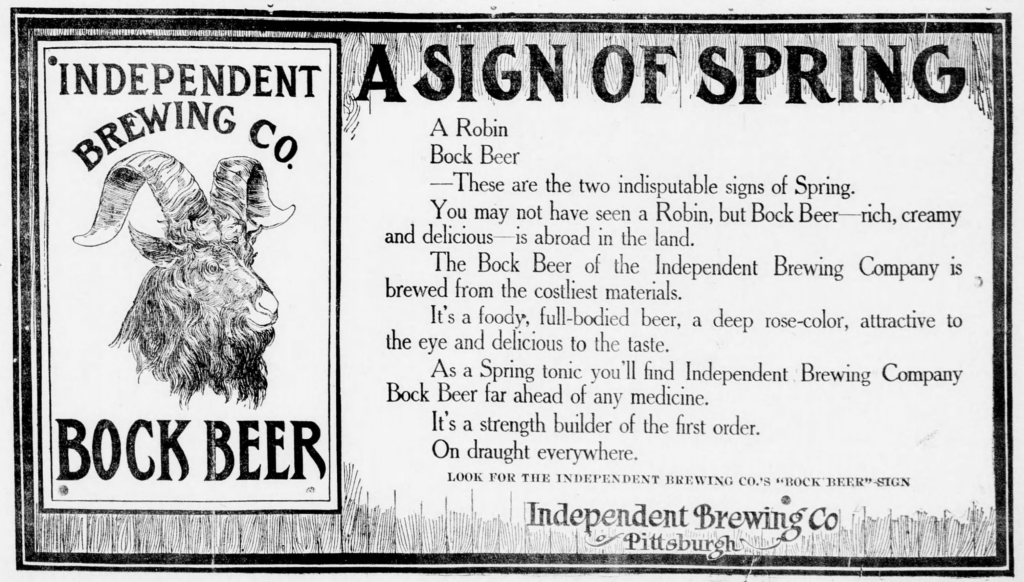 Sunday’s ad is for Old German Bock Beer, which was published on April 26, 1906. This ad was for the Independent Brewing Co. of Pittsburgh, Pennsylvania, which was founded in 1850 by Sebastien Heid and Xavier Walz, and went through several owners and and names before becoming the Independent Brewing Co. in 1904. This ad ran in The Monongahela Valley Republican, of Monongahela, Pennsylvania.