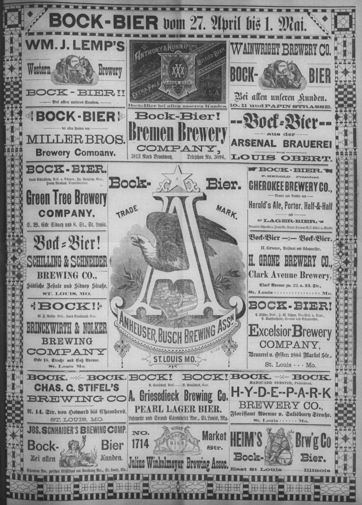 Monday’s first ad is for a number of different Bock Beers, which was published on April 27, 1899. This ad was for multiple breweries on a full page of ad each advertising their own seasonal bock beer. This ad ran in The Abend-Anzeiger, a German Language newspaper published in St. Louis, Missouri.