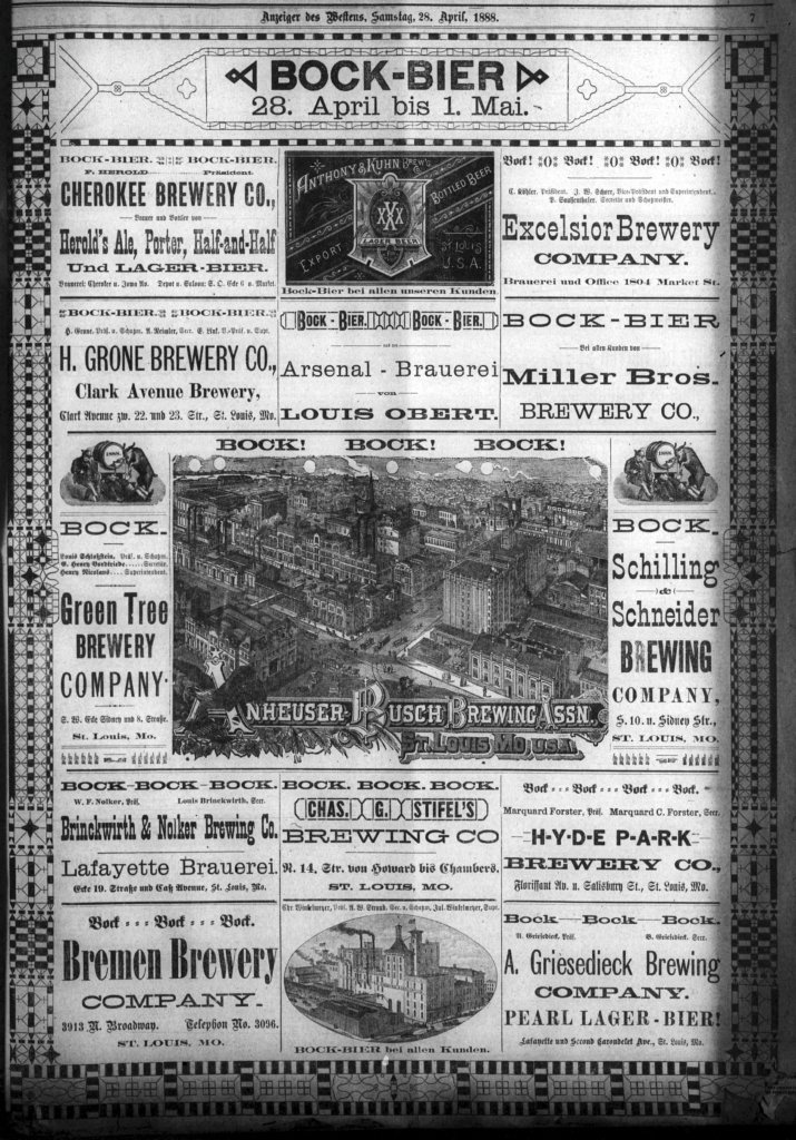 Tuesday’s ad is for a number of different Bock Beers, which was published on April 28, 1888. This ad was for multiple breweries on a full page of ad each advertising their own seasonal bock beer. This ad ran in The Abend-Anzeiger, a German Language newspaper published in St. Louis, Missouri.