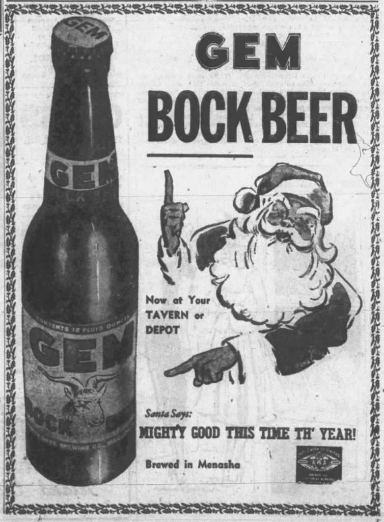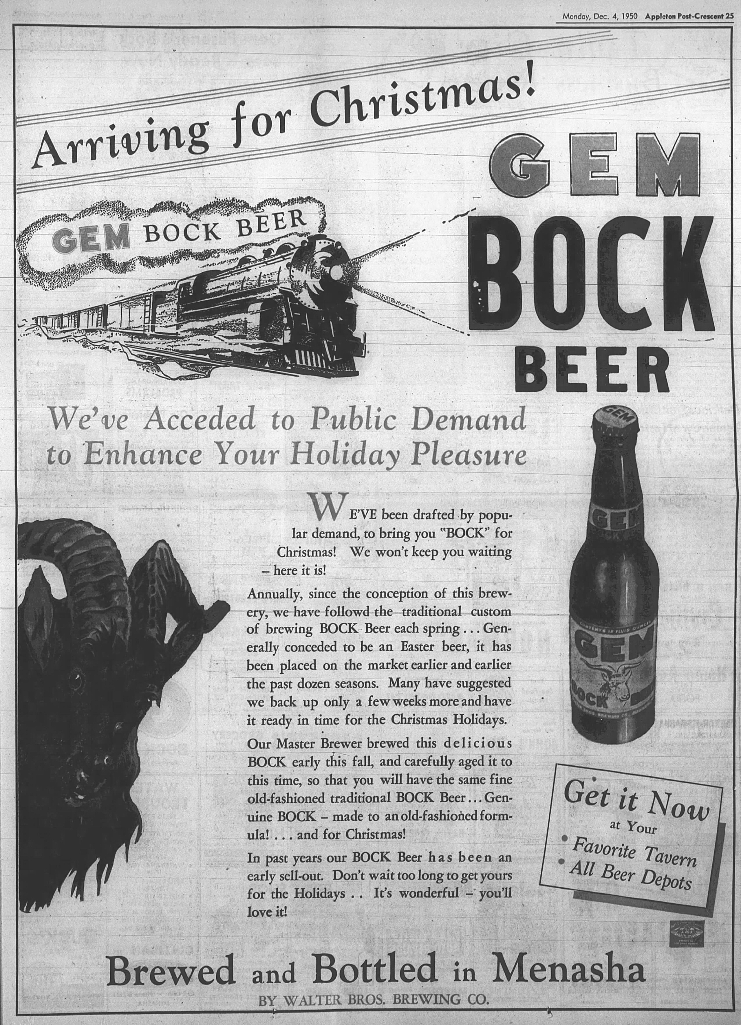 Sunday’s ad is for Pickwick Bock Beer, which was published on December 7, 1953. The brewery was the Haffenreffer Brewery of Boston, Massachusetts, which was originally founded in 1870. It was located in the Jamaica Plain area of Boston, and today the site of the brewery is where the Boston Beer Co. operates one of its breweries. This ad ran in The Republican, from Springfield, Massachusetts.