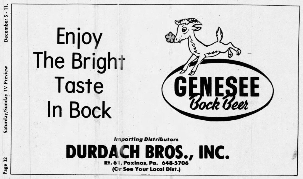 Sunday’s ad is for Pickwick Bock Beer, which was published on December 7, 1953. The brewery was the Haffenreffer Brewery of Boston, Massachusetts, which was originally founded in 1870. It was located in the Jamaica Plain area of Boston, and today the site of the brewery is where the Boston Beer Co. operates one of its breweries. This ad ran in The Republican, from Springfield, Massachusetts.