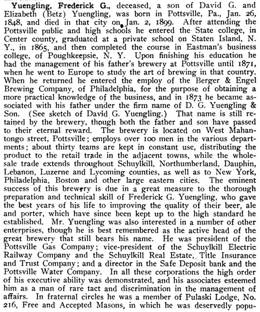 Immigrant Entrepreneurship, under German-American Business Biographies, has a lengthy one of David Gottlob Yuengling, Frederick’s father, but also touches on his son’s time running the brewery: