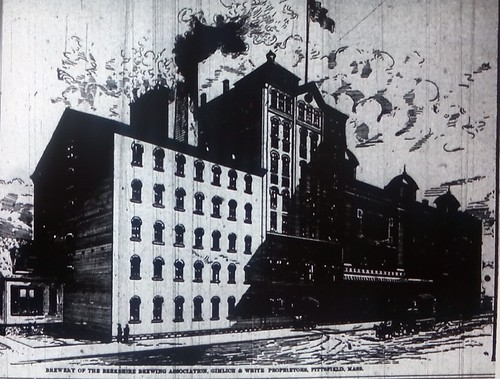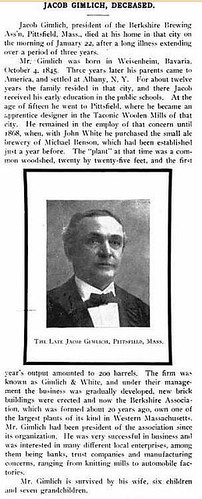 Today is the birthday of Jacob Gimlich (October 4, 1845-January 21, 1912). He was born in Weisenheim, Bavaria, but came to Massachusetts and bought the M. Benson Brewery of Pittsfield, with business partner John White, in 1868, only one year after it opened. They renamed it the unimaginative Jacob Gimlich & John White Brewery. In 1891, they changed its name to the Berkshire Brewing Association, and that remained its name until it closed due to prohibition in 1918 or 1919. “The brewery produced beers such as Greylock Ale, Mannheimer Lager, Lenox Half Stock Ale, Berkshire Lager, Berkshire Ale, and Superior Old Porter. In addition to beer, Mineral Water, Soda, and Malt Extracts were also produced. The brewery was a great success producing 75,000 barrels a year and distributed all over the northeast and as far south as the Carolinas.”