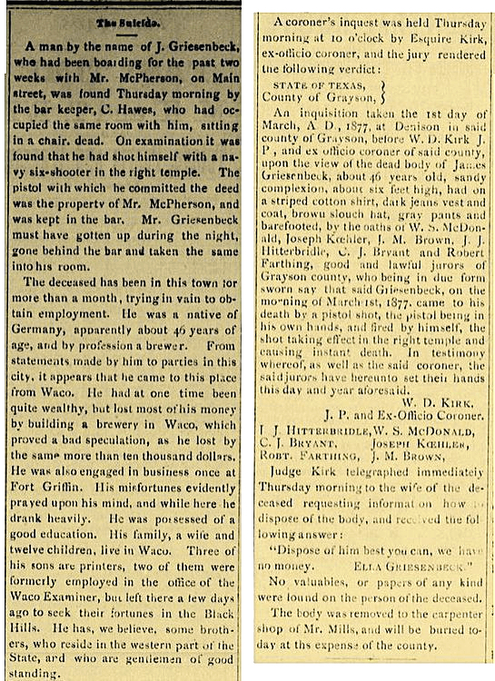 Today is the birthday of Julius Hermann “James” Griesenbeck (April 6, 1830-February 28, 1877). He was born in Materborn Gutersloh, Germany, but in 1852, when he was 22, his family took a ship to Galveston, Texas, and emigrated to the United States. Initially, they were in Comal County, but Julius, who begn using the first name ‘James,’ moved to nearby Waco, which had been incorporated in 1856. There he founded the James Griesenbeck Brewery in Waco, Texas, in 1870, but it was not successful, and closed just five years later, in 1875. Two years after that, he left his wife and their twelve children, supposedly to look for work, and rented a room above McPherson’s Saloon in Denison, Texas, where he turned his Navy pistol on himself, committing suicide.