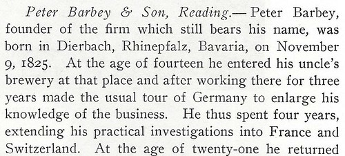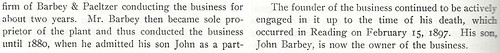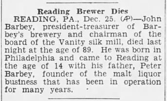 Apparently, Peter Barbery was just a brewer, but John was more of a shrewd businessman, and apparently made a fortune in the textile industry, which was quite prominent in Reading, PA. Though most of its gone now, the Reading Factory Outlets are still a reminder of that time. This account of his other business interests is from Forbes: