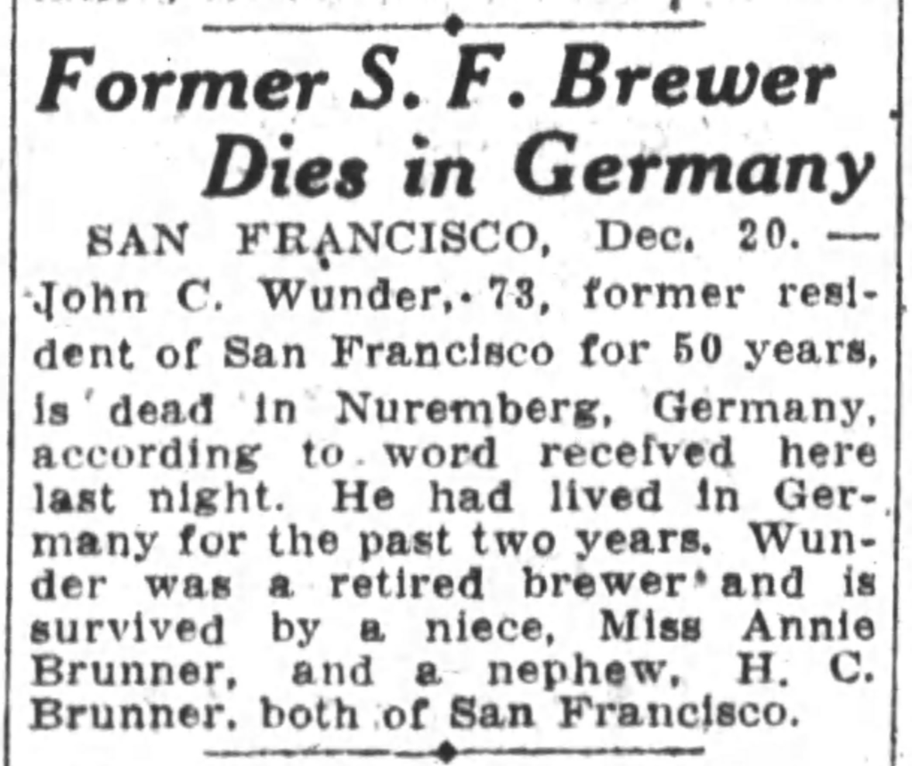 Two years after retiring to Germany, Wunder passed away in December of 1928 when he was 73 years old. This short obituary is from the Oakland Tribune on December 20, 1928: